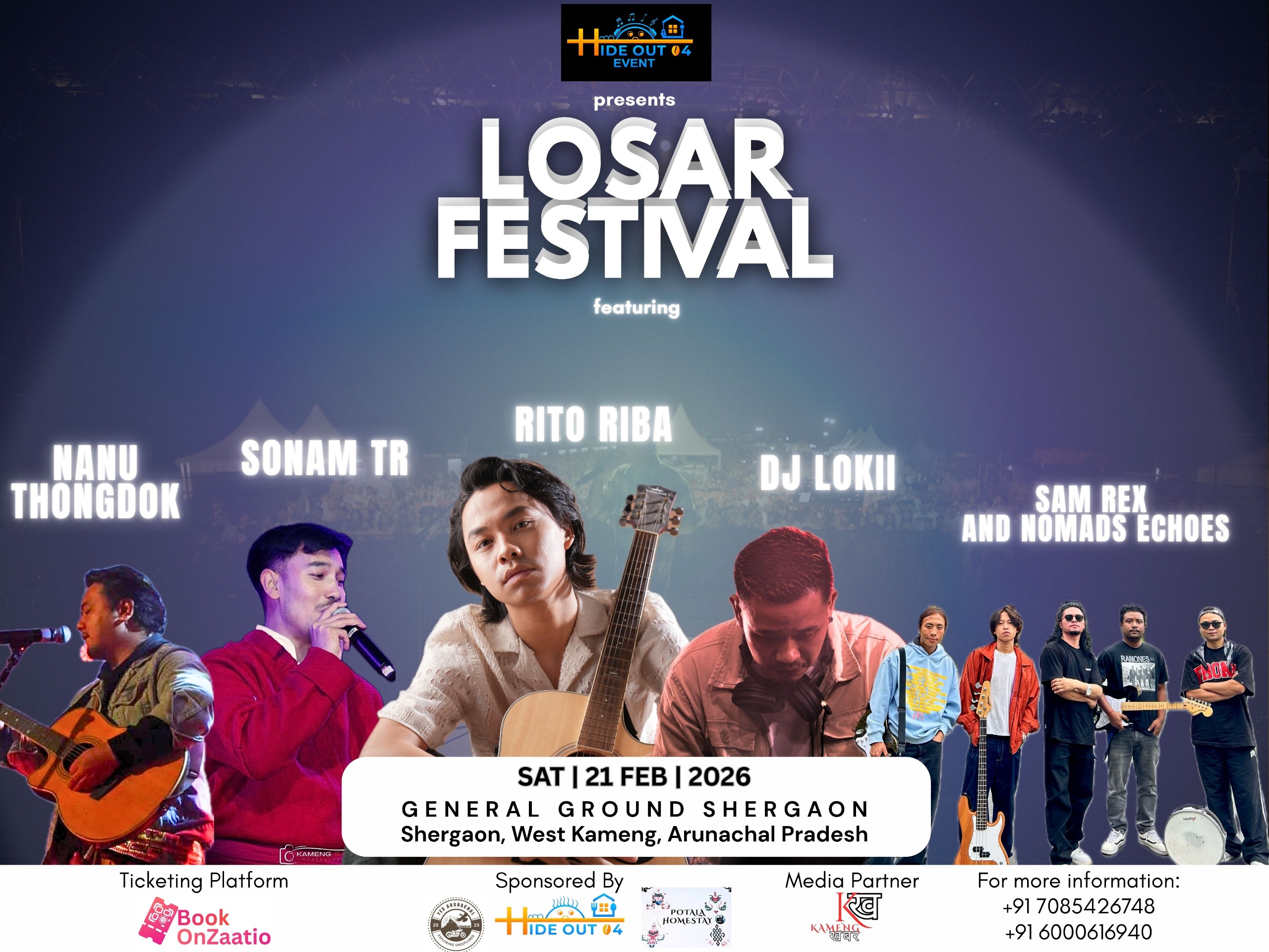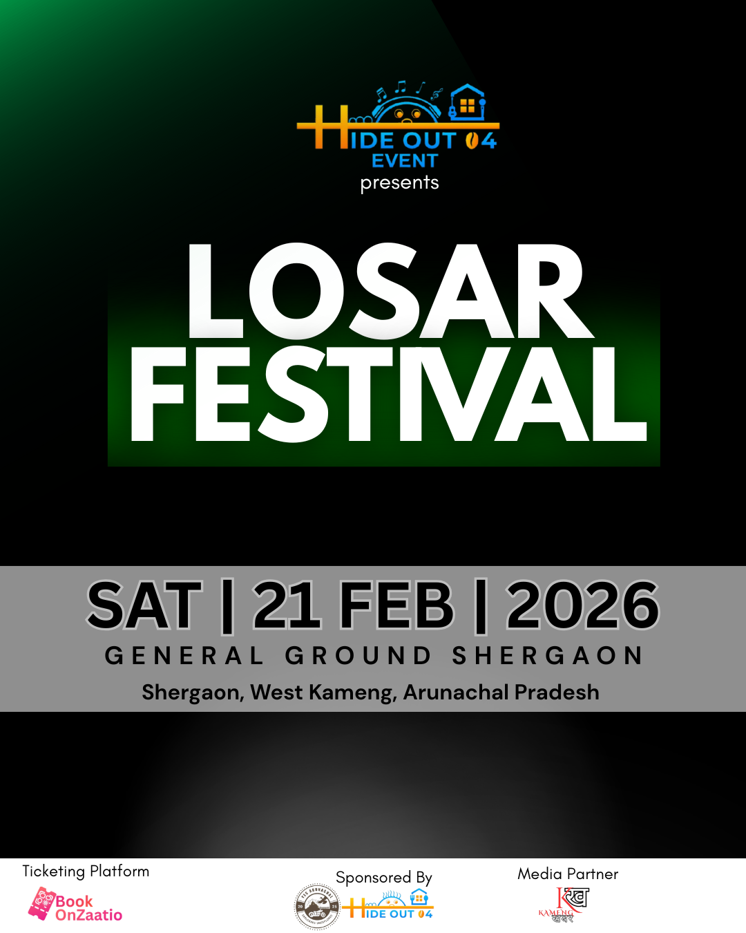 Losar Festival 2026, organised by Hideout04, is set to light up Shergaon, West Kameng, Arunachal Pradesh, with an unforgettable night of music, culture, and celebration. This is not just a festival—it’s a one-night, all-night musical experience that blends the traditional spirit of Losar with contemporary festival vibes in the breathtaking hills of Arunachal.If you’re searching for the best Losar celebration in Arunachal Pradesh, this is the event you should not miss.Losar Festival 2026 – Quick Event DetailsHere are the official details of Losar Festival 2026 Shergaon:Event Name: Losar Festival 2026Organiser: Hideout04Date: 21st February 2026Venue: General Ground, Shergaon, West Kameng, Arunachal Pradesh – 790002Duration: One-night, all-night musical celebrationThis festival is expected to attract music lovers, cultural explorers, and Losar celebrators from across Arunachal Pradesh and beyond.What Makes Losar Festival 2026 Special?Losar Festival 2026 in Shergaon is designed to deliver the perfect fusion of:1) Live Music PerformancesGet ready for a night packed with powerful live performances, high-energy crowd moments, and an electrifying stage experience.2) Losar Cultural ShowcasesThe festival celebrates the true spirit of Losar, bringing cultural performances and festive traditions to life.3) All-Night Festival AtmosphereThis is a one-night, all-night event, making it one of the most exciting music festivals in Arunachal Pradesh for 2026.4) Tradition Meets Modern MusicFrom soulful melodies to energetic beats, the festival creates a rare vibe where culture and modern music come together under the stars.Losar Festival 2026 Shergaon – Music, Culture & Festival VibesIf you love events that are more than just concerts, Losar Festival 2026 Arunachal Pradesh is built for you.Expect:A powerful artist lineup (live stage energy)Losar cultural celebration in a vibrant community settingFestival-style atmosphere with modern sound and lightingA night where togetherness, music, and tradition become oneThis is why people are calling it one of the most awaited Losar music festivals in Arunachal Pradesh.Entry Rules & Guidelines (Important)To ensure a smooth experience at Losar Festival 2026, please follow these official guidelines:Entry Policy: 1 Ticket = 1 PersonReporting Time: Entry must be completed at least 30 minutes before the event startsArriving early is recommended to avoid last-minute rush and to enjoy the full festival atmosphere.Why You Should Attend Losar Festival 2026 in ShergaonHere’s why Losar Festival 2026 Shergaon should be on your travel and festival list:Experience one of the top festivals in Arunachal Pradesh 2026Enjoy an all-night music celebration with a high-energy lineupCelebrate Losar in a truly cultural and vibrant settingWitness the scenic beauty of Shergaon’s hills and landscapeBe part of a grand music + cultural festival that stands out from typical eventsWhether you’re coming for the culture, the music, or the vibe—Losar Festival 2026 is the perfect destination.Losar Festival 2026 Location: Shergaon, West KamengShergaon is known for its scenic beauty and peaceful hill-station feel, making it an ideal backdrop for a festival like this.Venue:General Ground, Shergaon, West Kameng, Arunachal Pradesh – 790002If you want a festival experience that feels fresh, natural, and cinematic—Shergaon is the place.For Enquiry - 6000493349